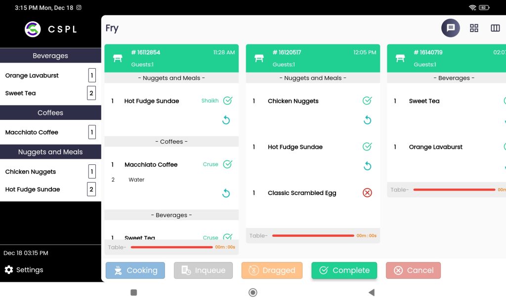 Real-time updates on the status of each order. Reminder in case order is ready or delayed from Kitchen.